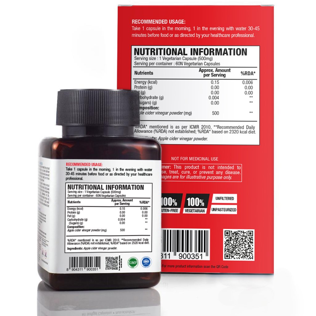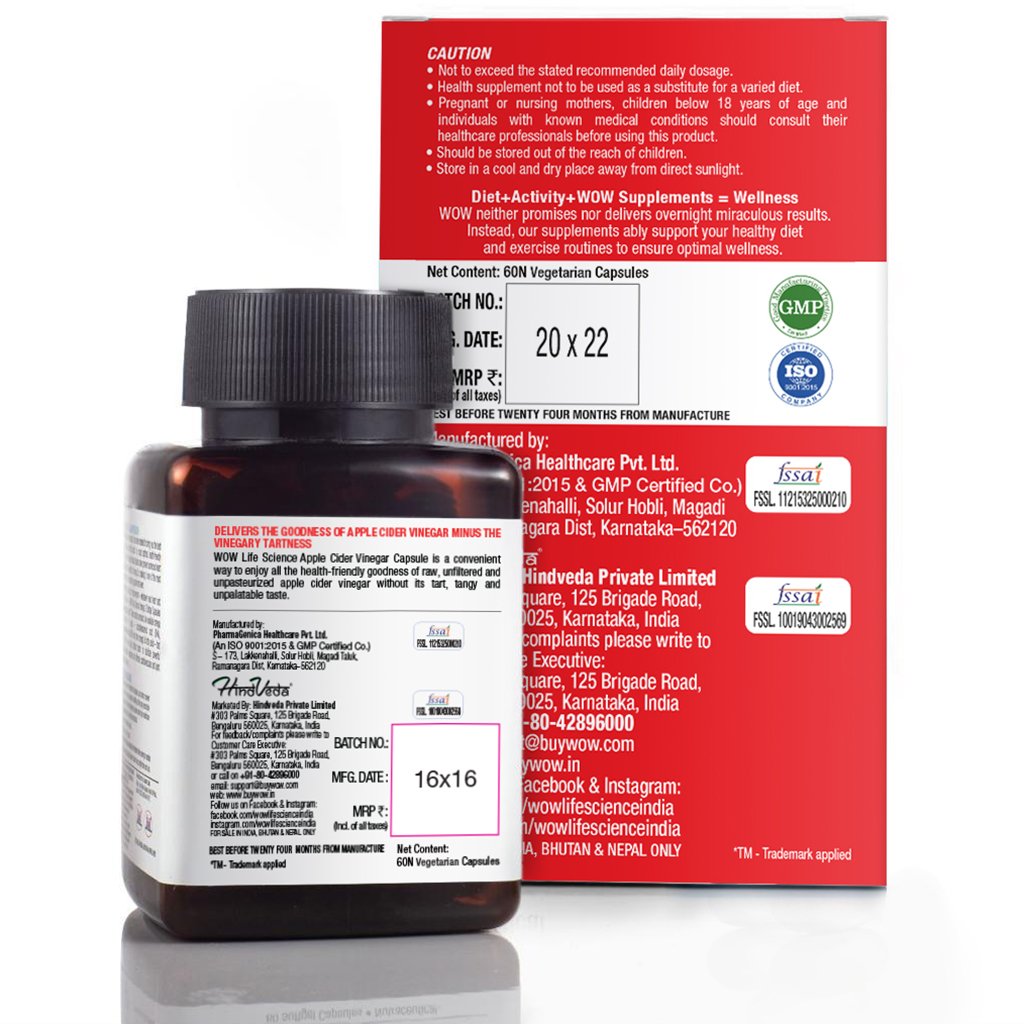 Wow Life Science Apple Cider Vinegar Supplement gives you all the health benefits of Apple Cider Vinegar in a capsule form without the acidic aftertaste. Apple cider vinegar has restorative effect on your body, helps control blood sugar, and lower cholesterol levels. It has shown good results in weight loss management. Each Apple Cider Vinegar Supplement capsule has pure apple cider vinegar powder made from cider from Himalayan apples.